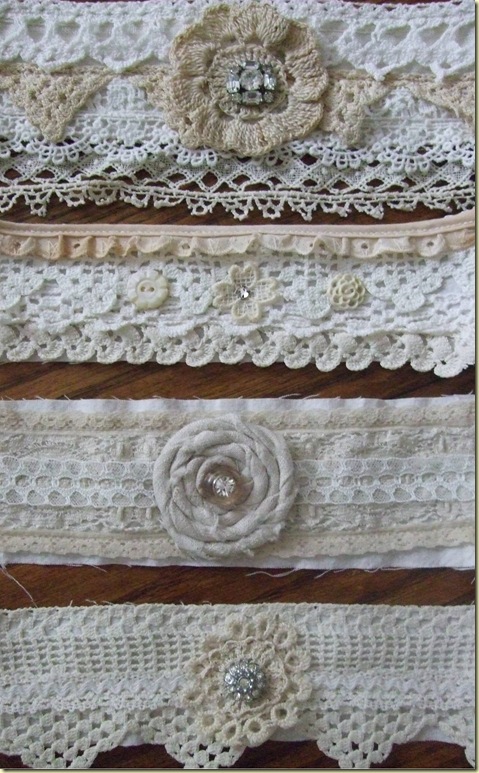 And finally, a little project I worked on at Leah’s house last week. Inspired by this gal, I made a few of these cute wristlets or wrist cuffs, using vintage lace, trim and buttons. Love these!